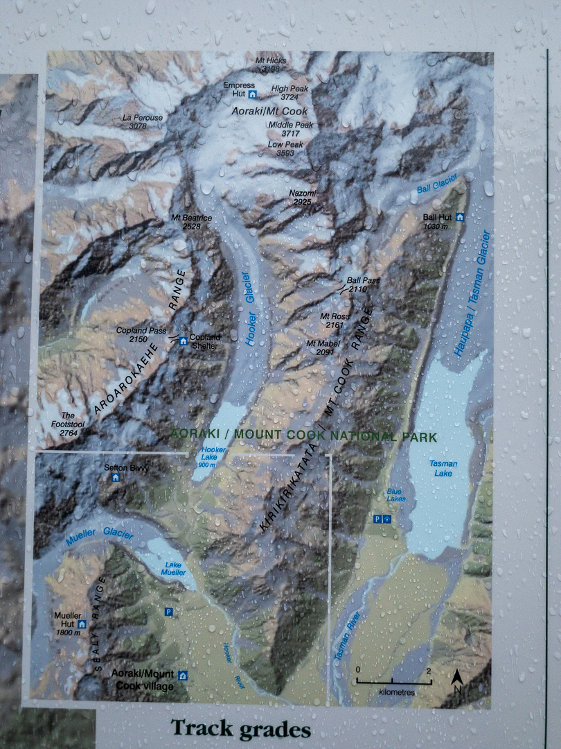 Unfortunately, our hike on the Hooker Valley Track started out with rainy, cold weather. This hike is stunning and the most popular in the park. We decided to start out, with our fingers and toes crossed, that things would change. There was no Mount Cook in sight. We stopped several people who said the weather was worse farther on but we persevered. We stopped the the Mueller Lake overlook and were awed at the sight and sound of glacial rivers and mountains soaring all around.